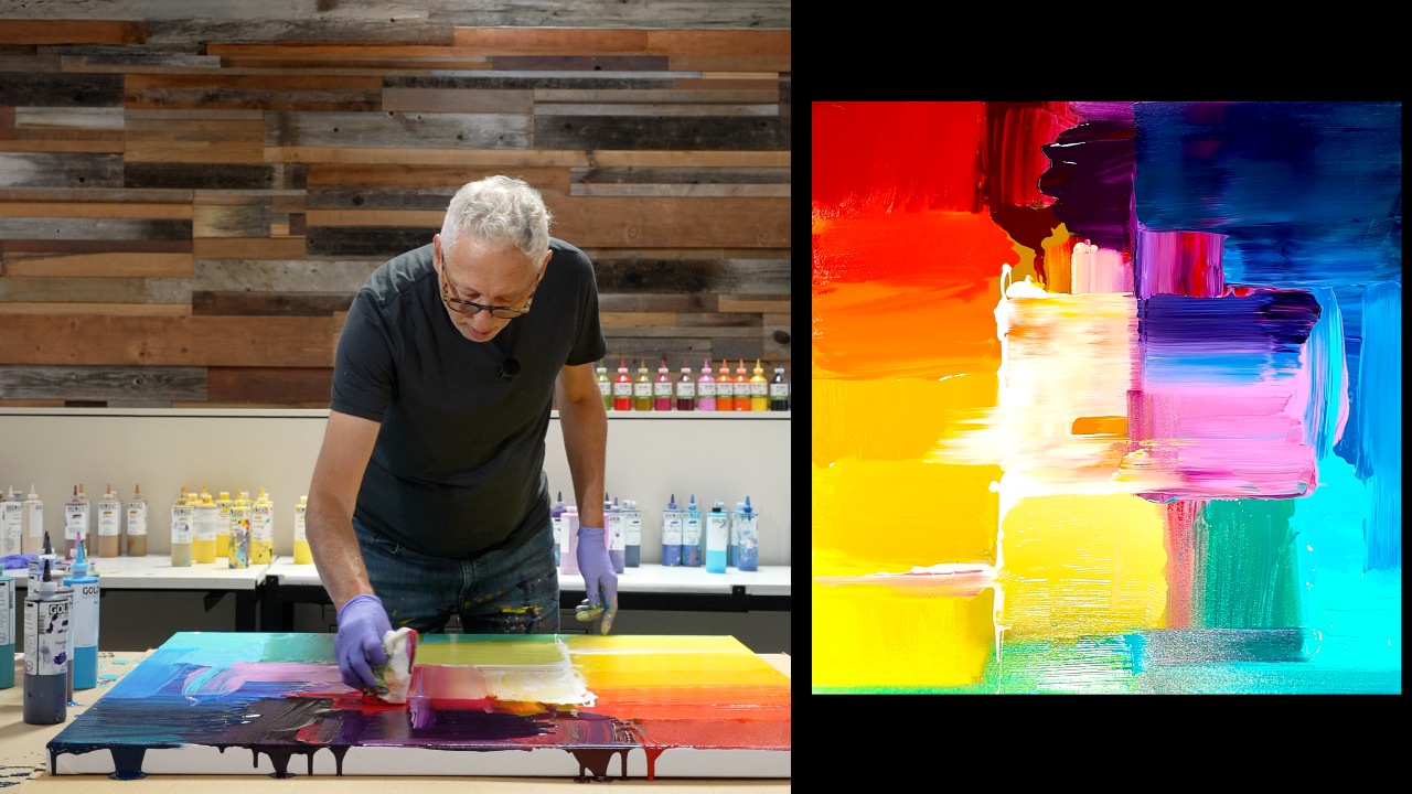Step into the abstract with Simon Bull's vibrant and expressive online class where he shares his unique approach to creating colorful cubist-inspired compositions. In this bold exploration of form and color, Simon trades in traditional tools for paper towels, using them to blend, layer, and scrape paint across the canvas.